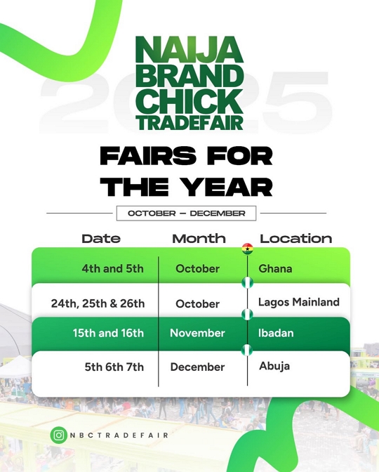 Our 11th fair for 2025 holds in Lagos on the 24th to 26th of October at Whitestone Event Center, Oregun, Ikeja, Lagos State. For other dates, click on this link to view all dates.